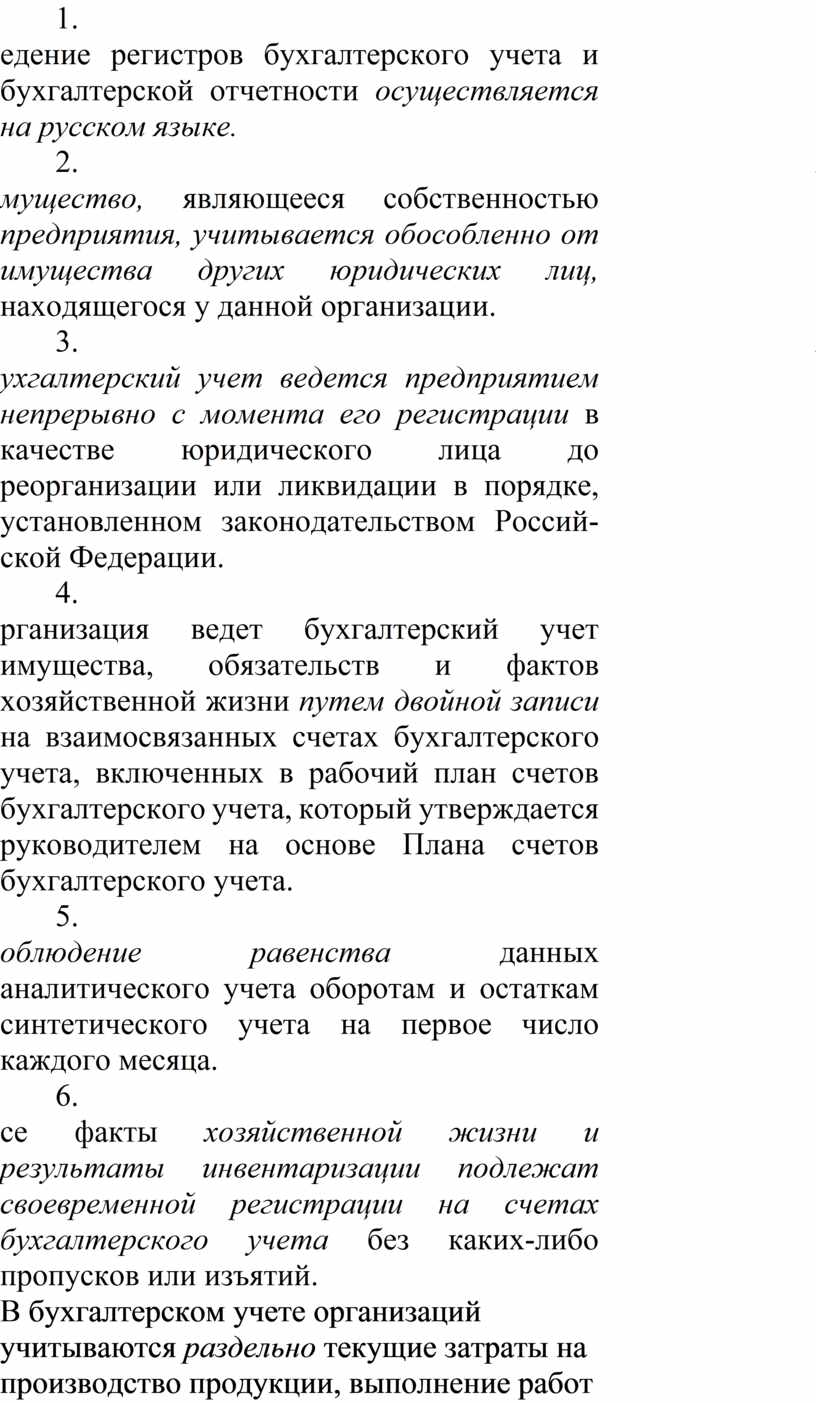 1. Бухгалтерский учет имущества, обязательств и фактов хозяйственной жизни ведется в валюте Российской Федерации — рублях. Документирование имущества, обязательств и иных фактов хозяйственной деятельности, ведение регистров бухгалтерского учета и бухгалтерской отчетности осуществляется на русском языке.
