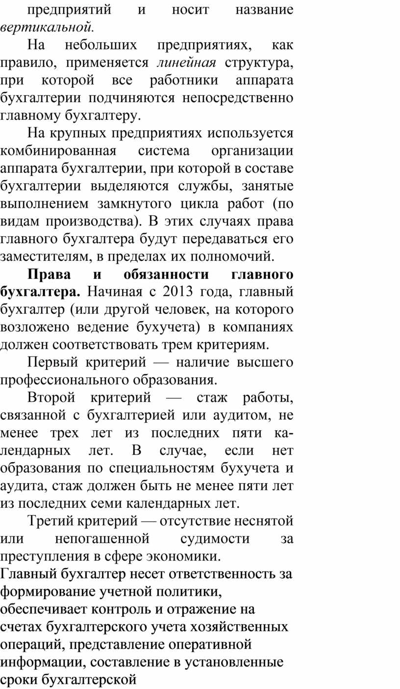 Рассмотренная структура организации аппарата бухгалтерии применяется на большинстве средних, а иногда и крупных предприятий и носит название вертикальной.