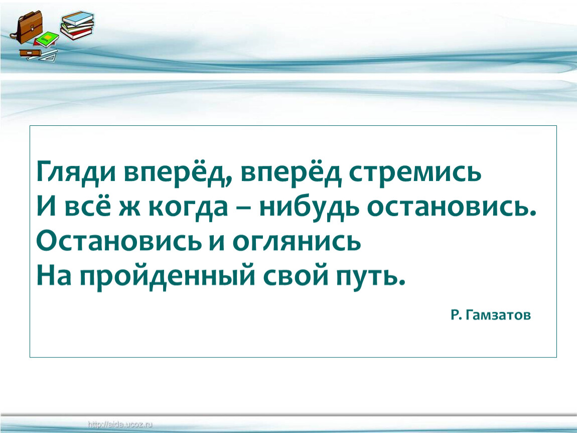 Гляди вперёд, вперёд стремись И всё ж когда – нибудь остановись. Остановись и оглянись На пройденный свой путь. Р. Гамзатов