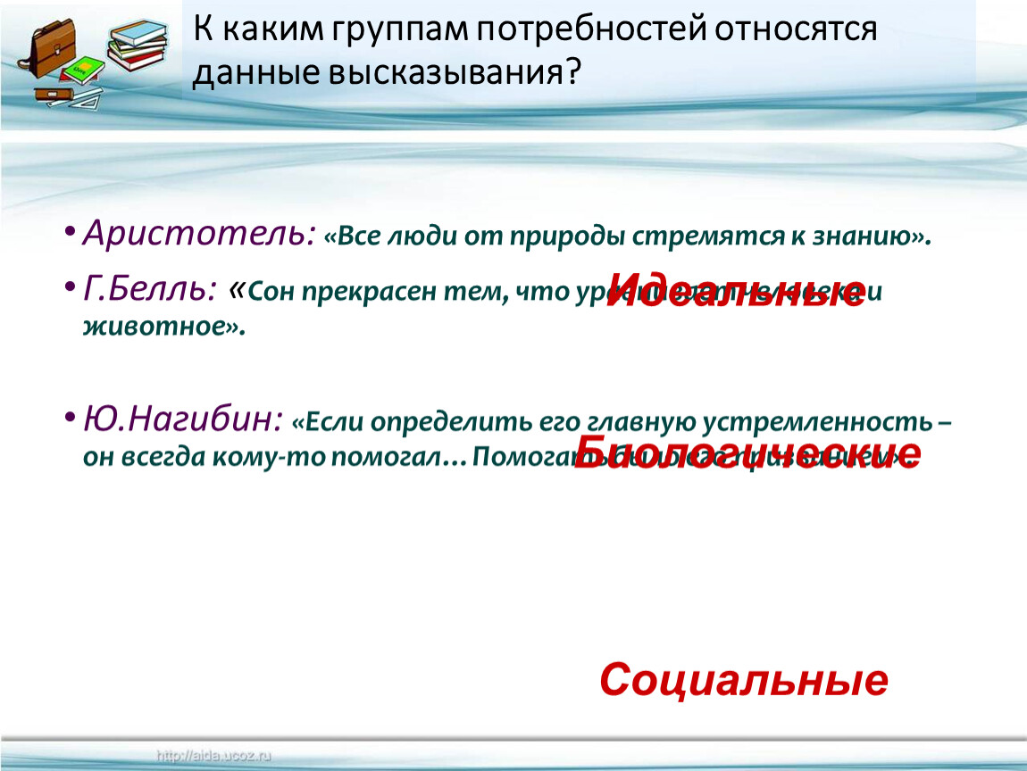 (Биологические потребности, социальные потребности, идеальные потребности )