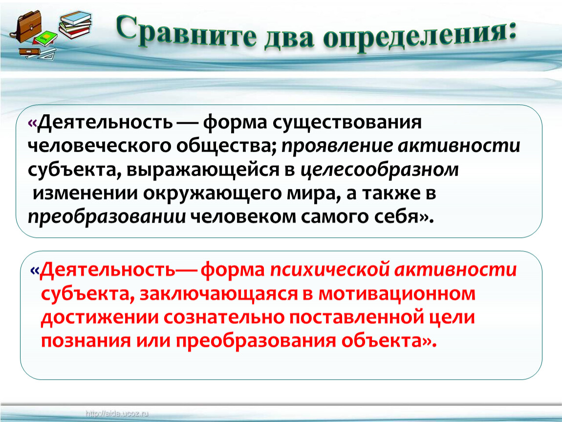 «Деятельность— форма психической активности субъекта, заключающаяся в мотивационном достижении сознательно поставленной цели познания или преобразования объекта».
