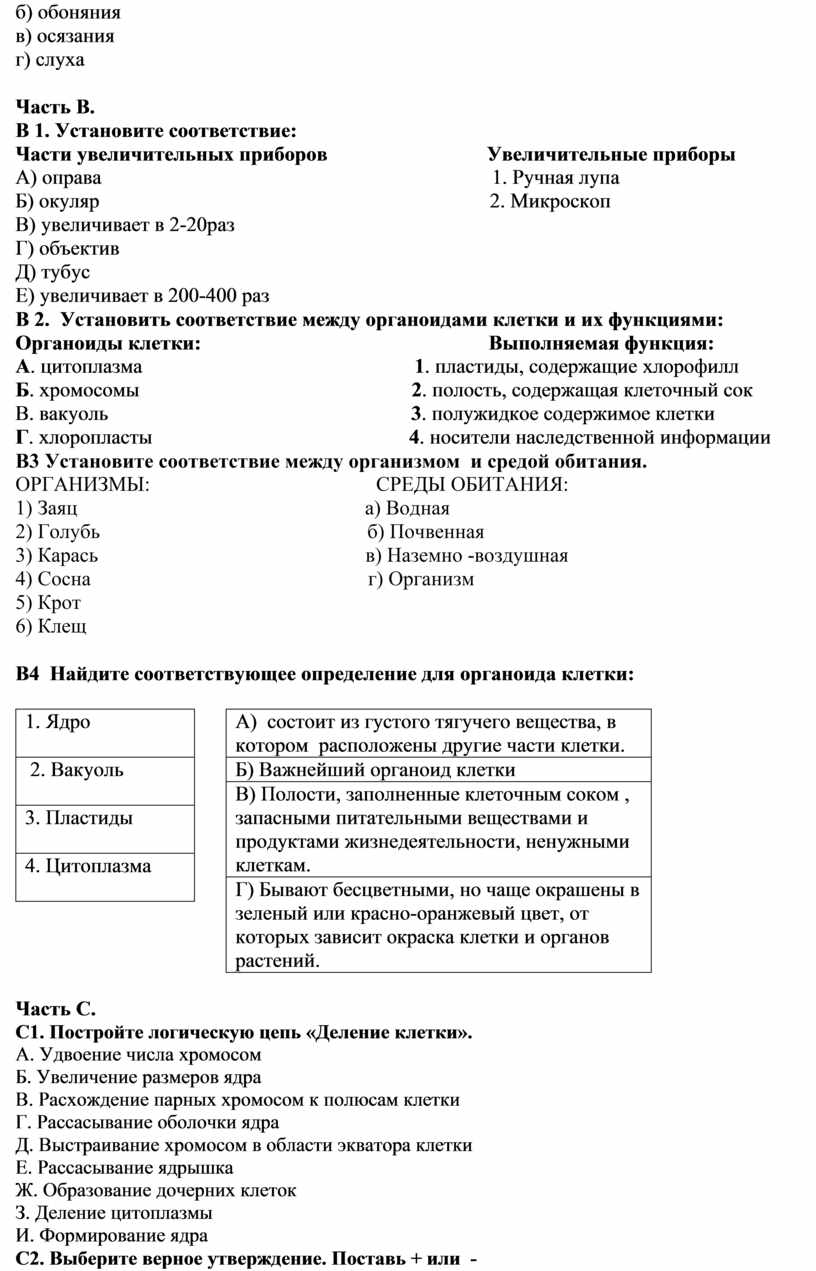 Диагностическая контрольная работа по темам: «Введение в биологию», «Клеточное строение организмов»