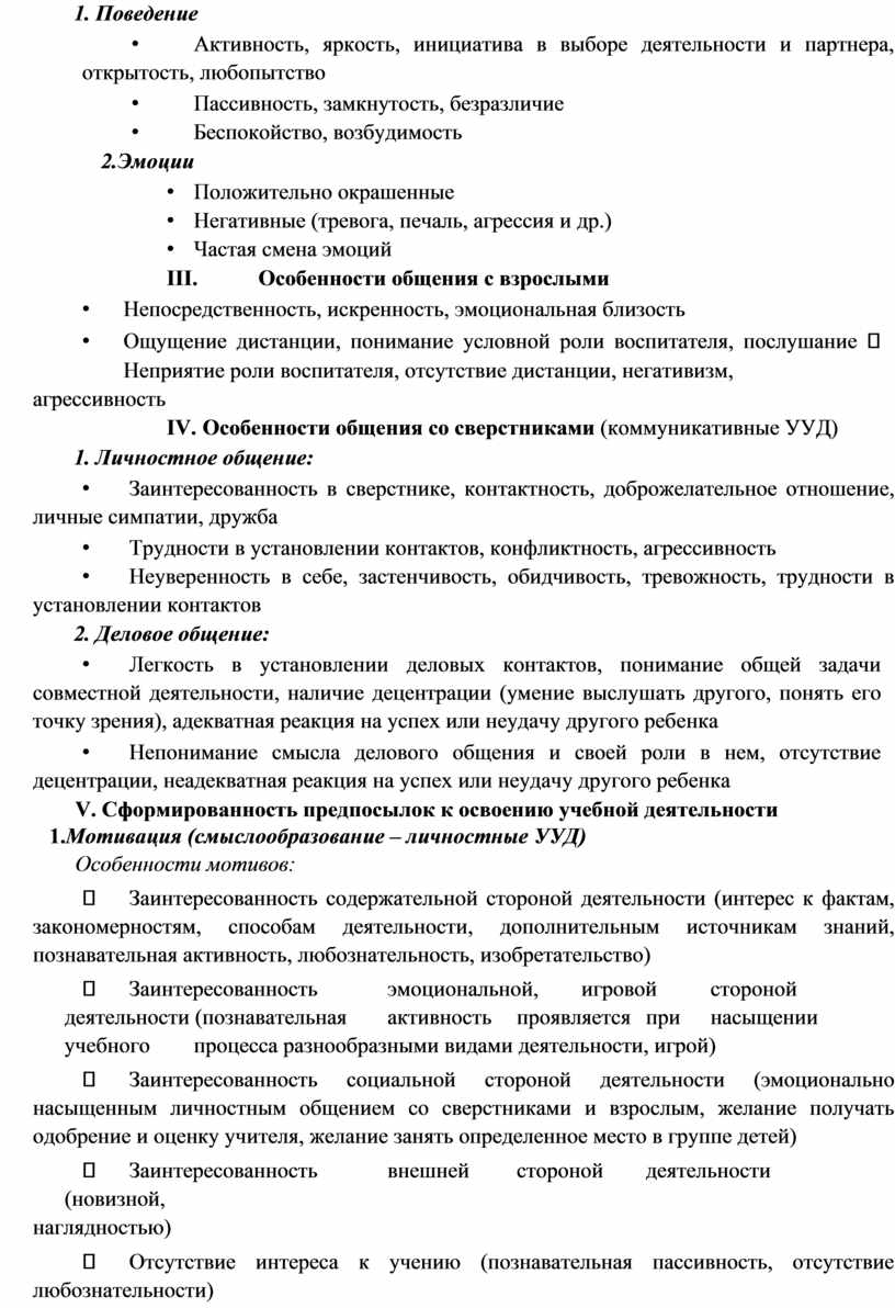 Уважаемые педагоги! Просим вас провести наблюдение за ребенком (примерно в течение 1-2 недель) по следующим показателям: особенности самовыражения ребенка, особенности общения со сверстниками и взрослыми, сформированность предпосылок к освоению учебной деятельности. Отметьте кружком или галочкой характерные проявления данного ребенка. Наиболее яркие особенности по каждому показателю можно выделить (подчеркнуть).