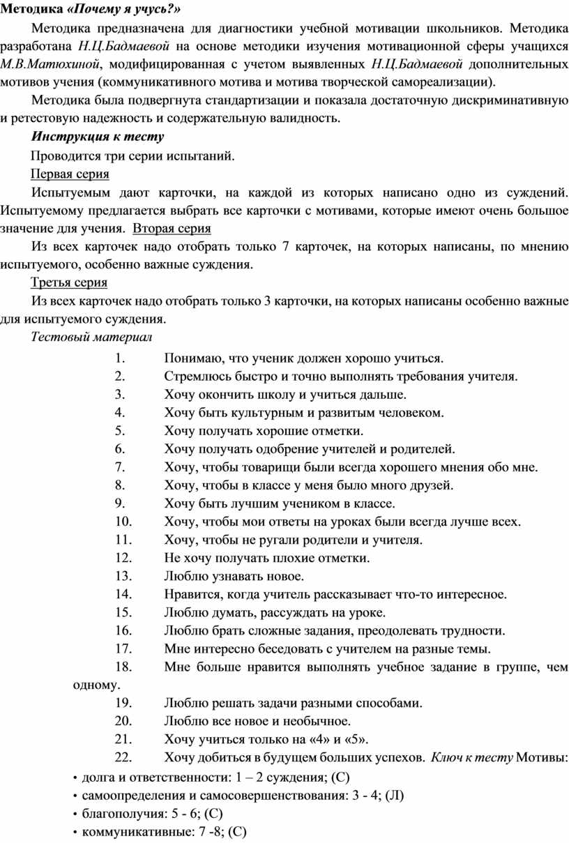 22. Хочу добиться в будущем больших успехов. Ключ к тесту Мотивы: