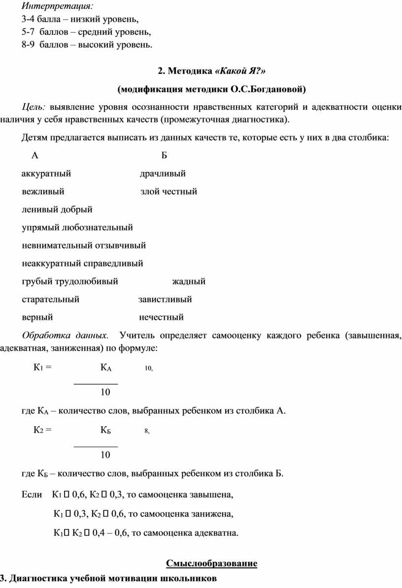 Цель: выявление уровня осознанности нравственных категорий и адекватности оценки наличия у себя нравственных качеств (промежуточная диагностика).
