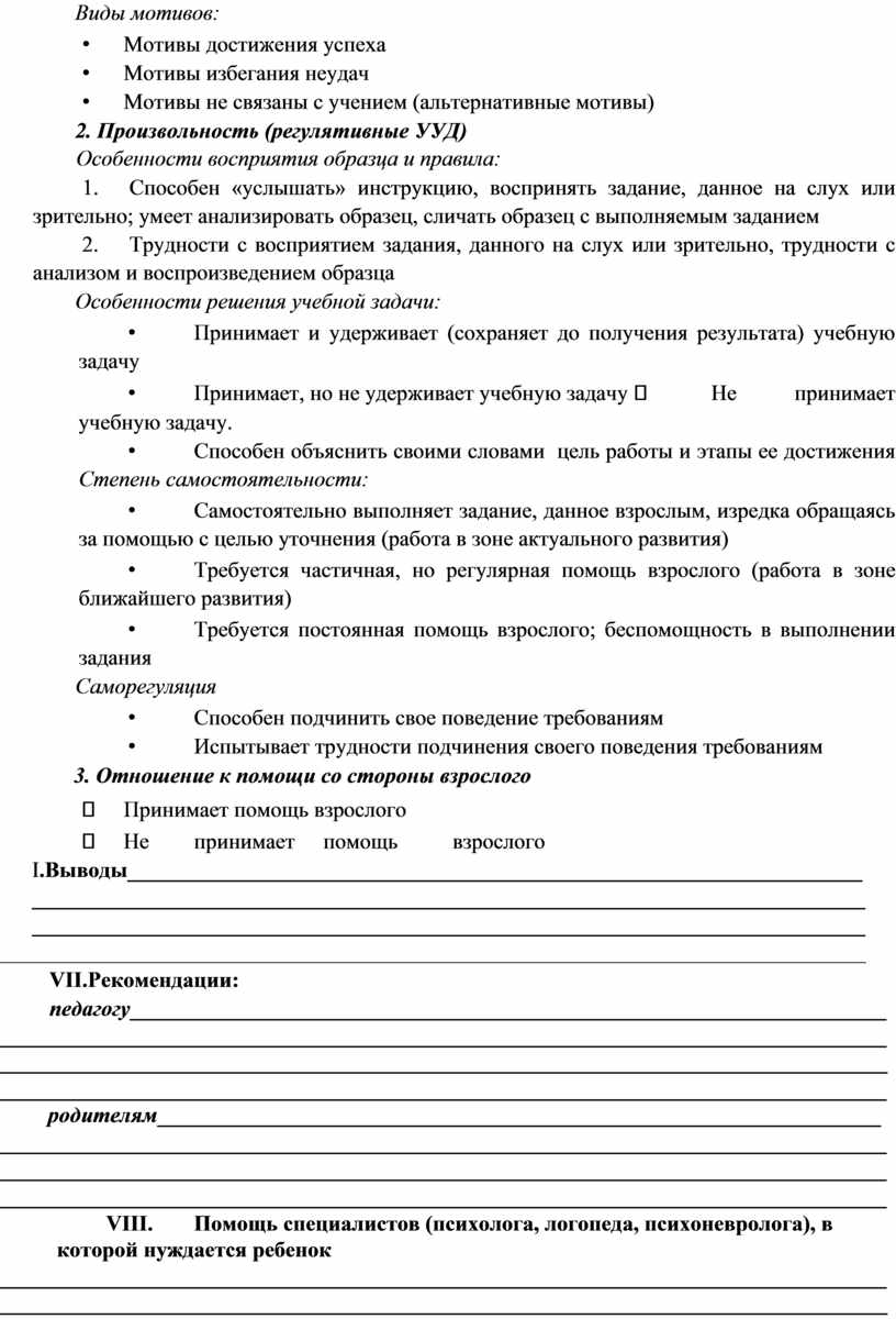 VIII. Помощь специалистов (психолога, логопеда, психоневролога), в которой нуждается ребенок