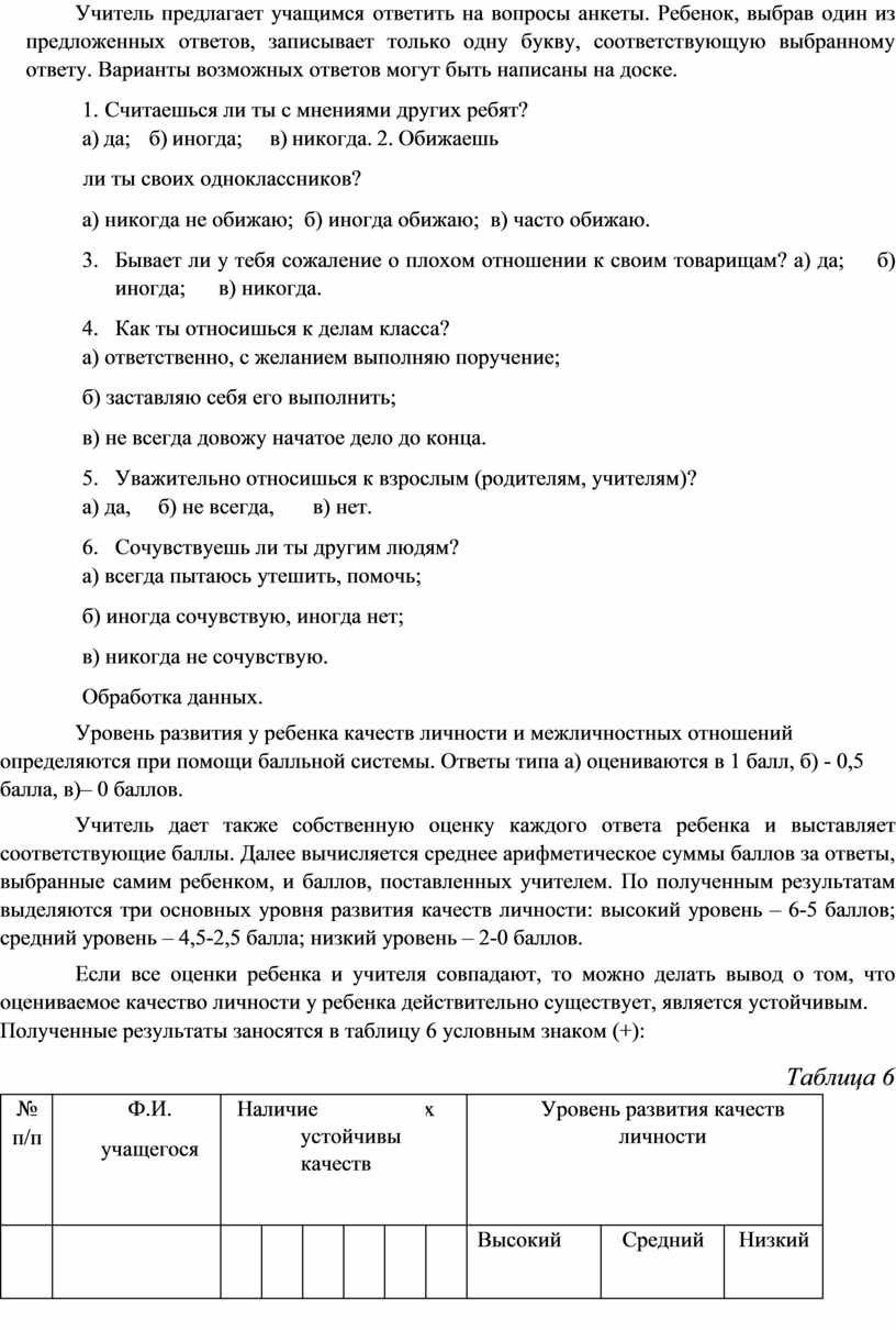 Учитель дает также собственную оценку каждого ответа ребенка и выставляет соответствующие баллы. Далее вычисляется среднее арифметическое суммы баллов за ответы, выбранные самим ребенком, и баллов, поставленных учителем. По полученным результатам выделяются три основных уровня развития качеств личности: высокий уровень – 6-5 баллов; средний уровень – 4,5-2,5 балла; низкий уровень – 2-0 баллов.