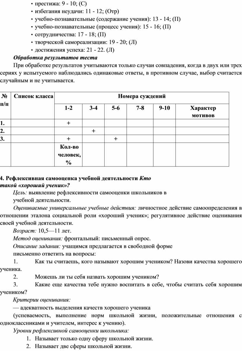 (успеваемость, выполнение норм школьной жизни, положительные отношения с одноклассниками и учителем, интерес к учению).