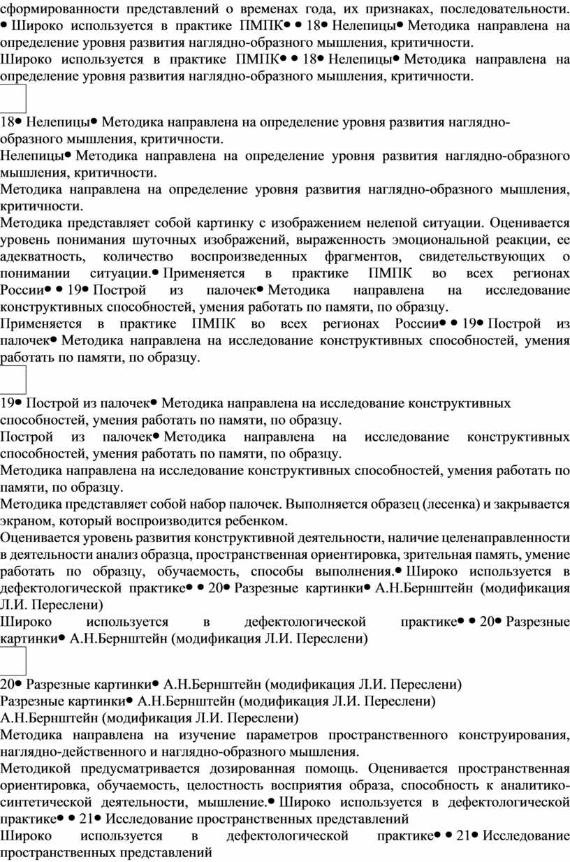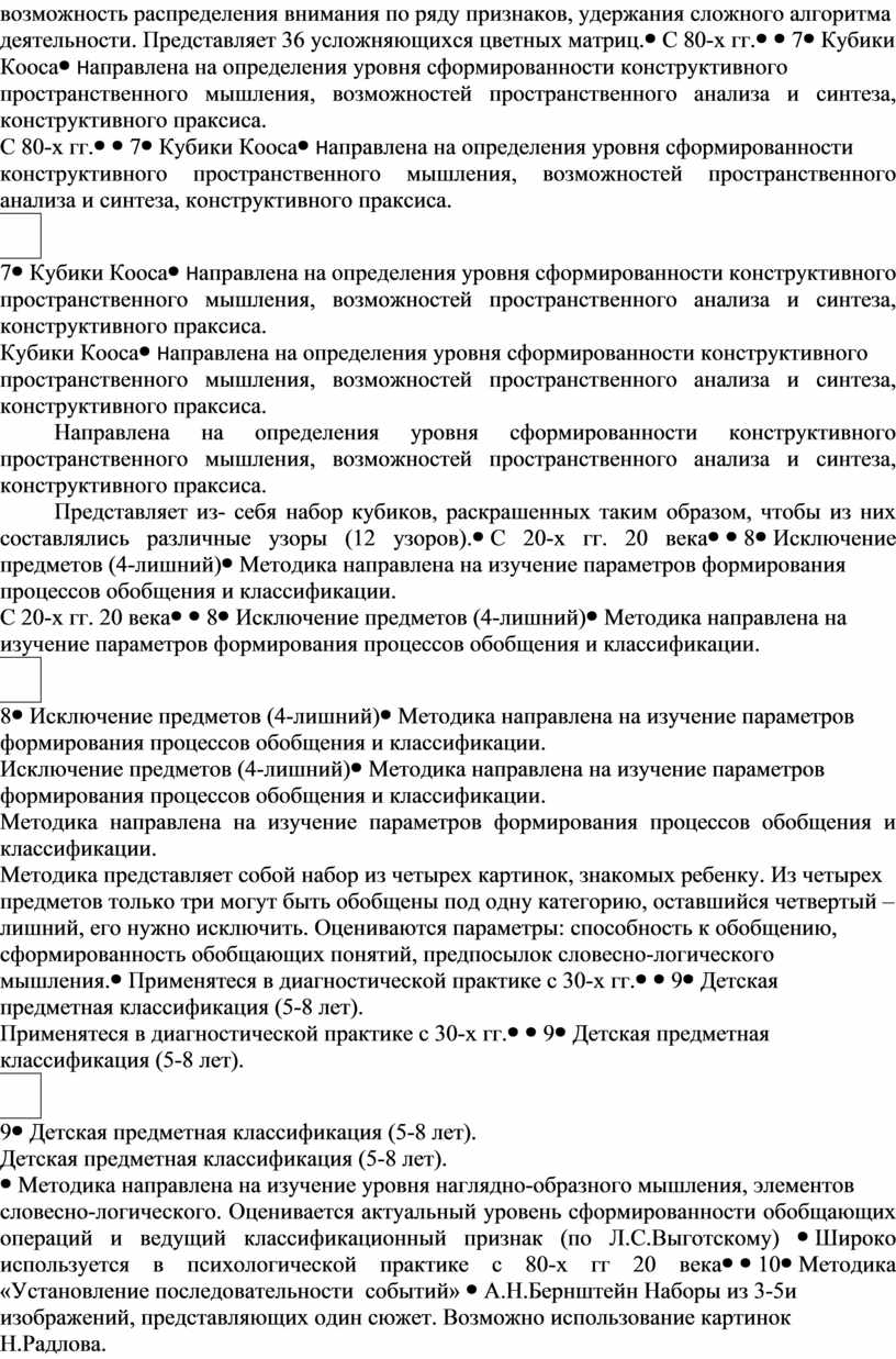 А.Н.Бернштейн (модификация Л.И. Переслени) Методика направлена на изучение параметров пространственного конструирования, наглядно-действенного и наглядно-образного мышления. Методикой предусматривается дозированная помощь. Оценивается пространственная ориентировка, обучаемость, целостность восприятия образа, способность к аналитико-синтетической деятельности, мышление. |