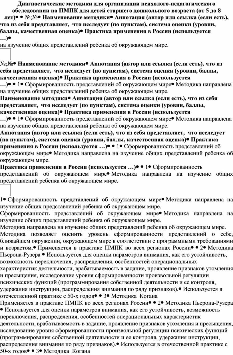 Диагностические методики для организации психолого-педагогического обследовании на ПМПК для детей старшего дошкольного возраста (от 5 до 8 лет) |
