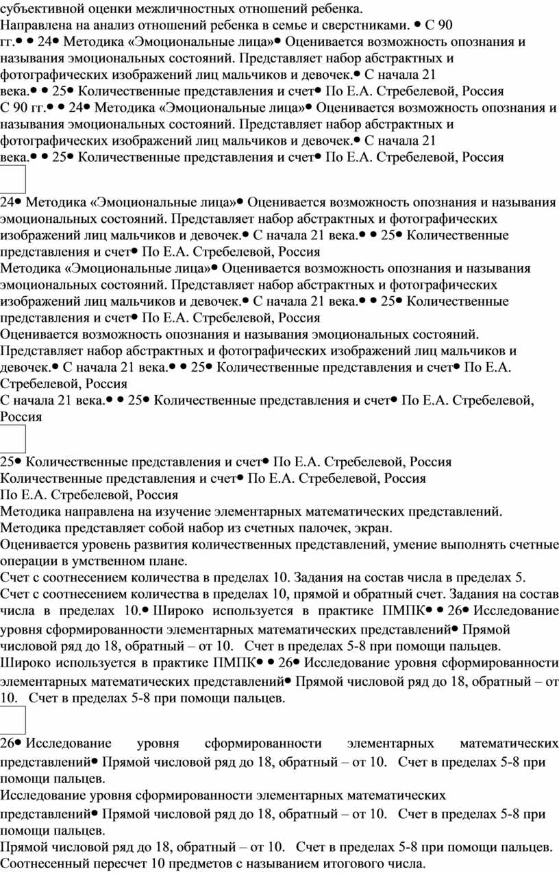 По Е.А. Стребелевой, Россия Методика направлена на изучение элементарных математических представлений. Методика представляет собой набор из счетных палочек, экран. Оценивается уровень развития количественных представлений, умение выполнять счетные операции в умственном плане. Счет с соотнесением количества в пределах 10. Задания на состав числа в пределах 5. Счет с соотнесением количества в пределах 10, прямой и обратный счет. Задания на состав числа в пределах 10. |