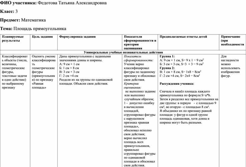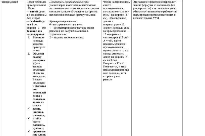 Показатель сформированности: ученик верно и осознанно использовал математические термины для построения связного устного объяснения алгоритма нахождения площади прямоугольника