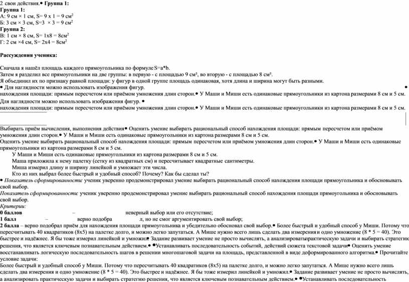 Показатель сформированности: ученик уверенно продемонстрировал умение выбирать рациональный способ нахождения площади прямоугольника и обосновывать свой выбор. Критерии: 0 баллов – неверный