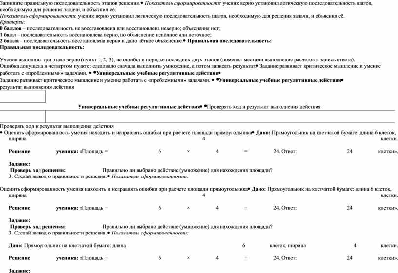 Правильная последовательность: 1, 2, 3,3,5,4 Ученик выполнил три этапа верно (пункт 1, 2, 3), но ошибся в порядке последних двух этапов (поменял местами выполнение расчетов и запись ответа). Ошибка допущена в четвертом пункте: следовало сначала выполнить умножение, а потом записать результат. |