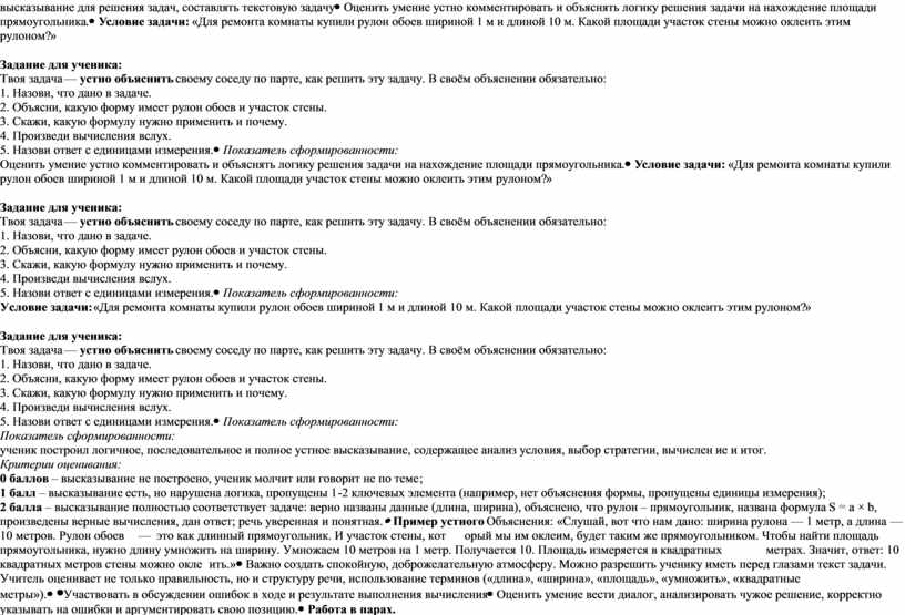 Показатель сформированности: ученик построил логичное, последовательное и полное устное высказывание, содержащее анализ условия, выбор стратегии, вычисление и итог. Критерии оценивания: 0