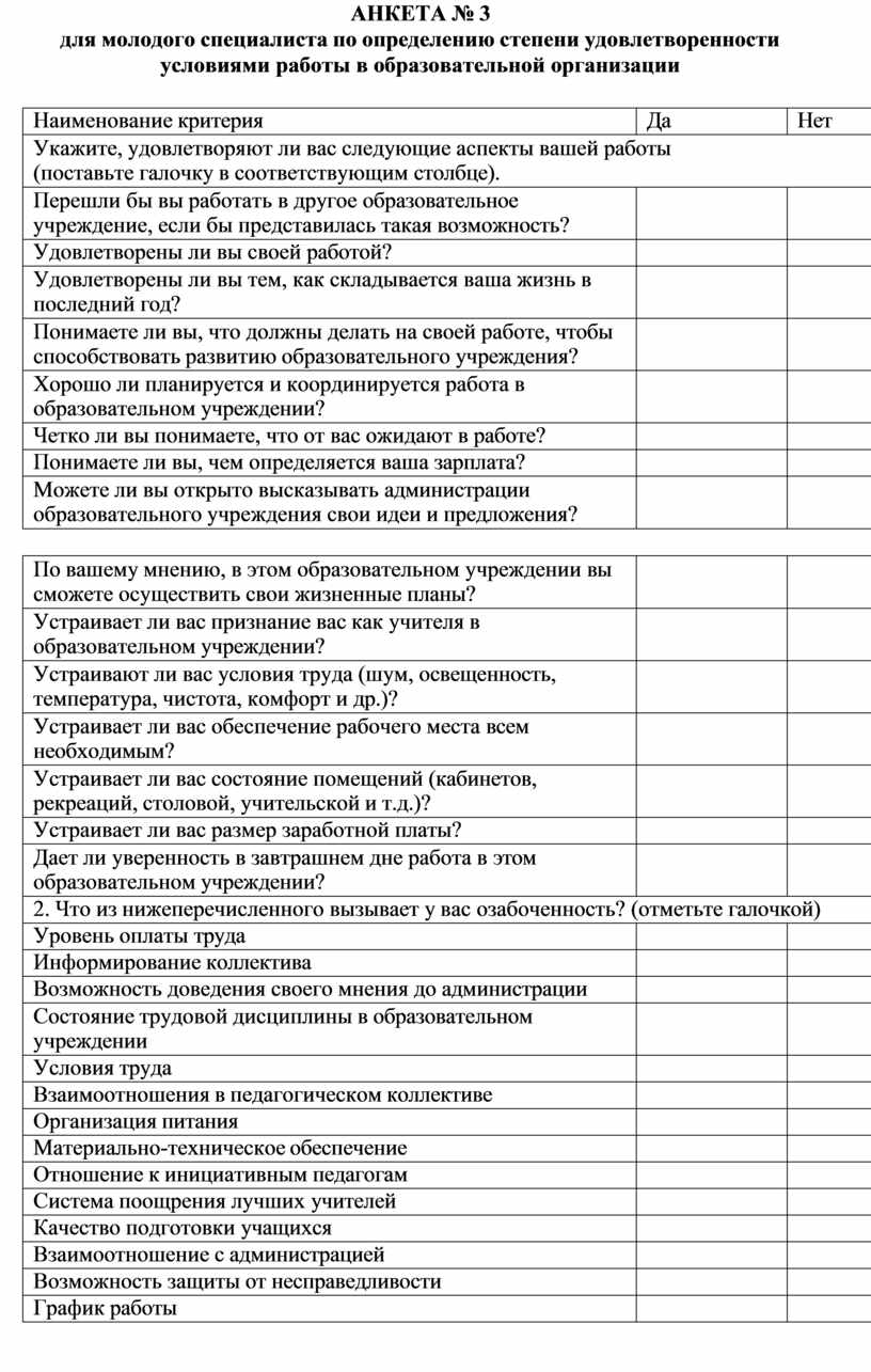 для молодого специалиста по определению степени удовлетворенности условиями работы в образовательной организации
