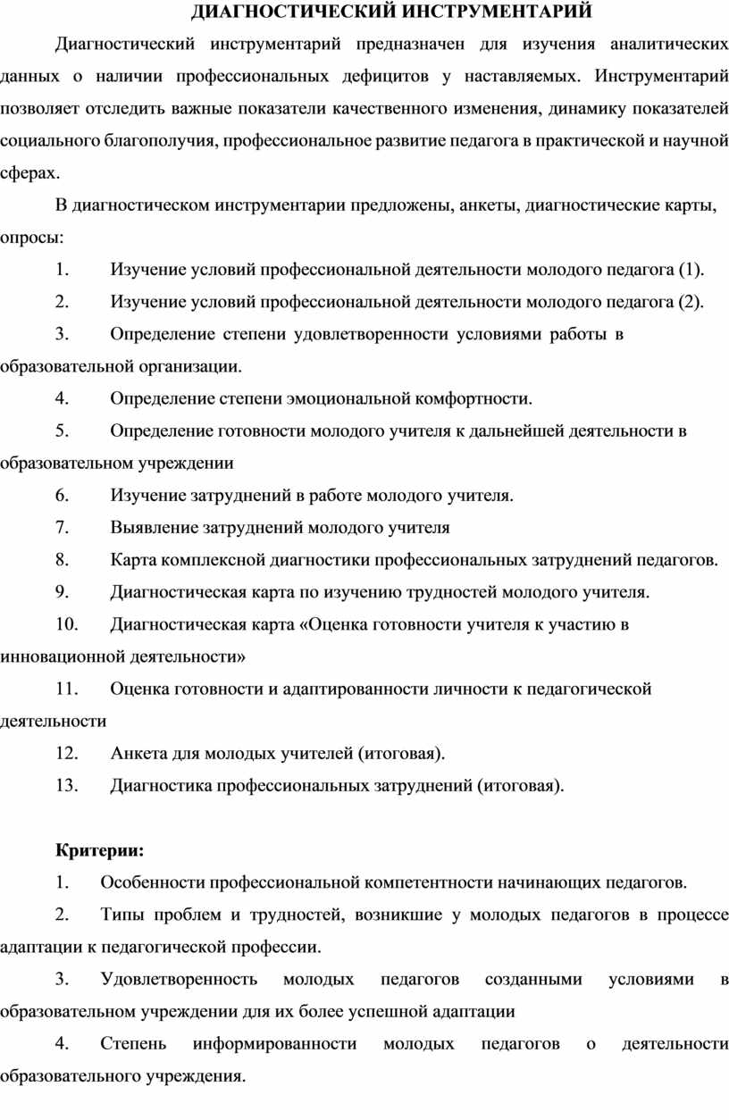 Диагностический инструментарий предназначен для изучения аналитических данных о наличии профессиональных дефицитов у наставляемых. Инструментарий позволяет отследить важные показатели качественного изменения, динамику показателей социального благополучия, профессиональное развитие педагога в практической и научной сферах.