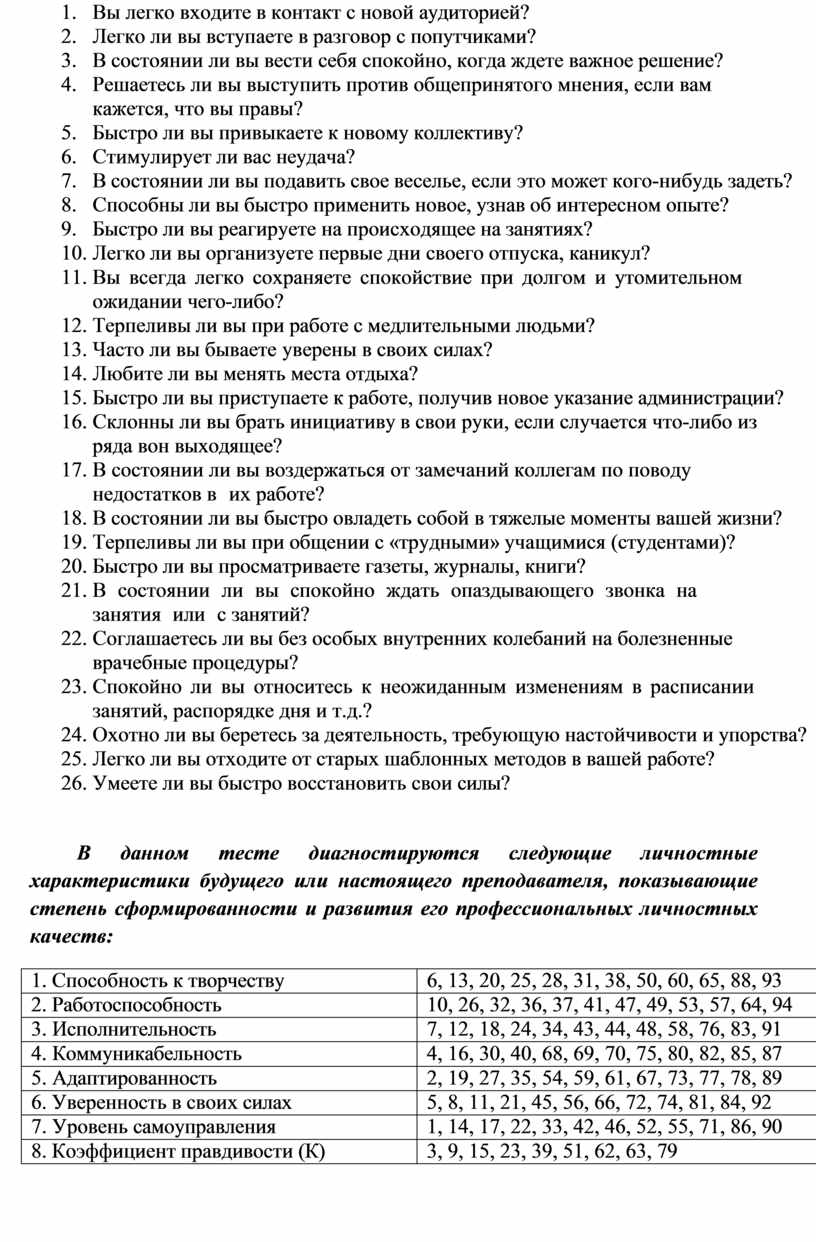В данном тесте диагностируются следующие личностные характеристики будущего или настоящего преподавателя, показывающие степень сформированности и развития его профессиональных личностных качеств: