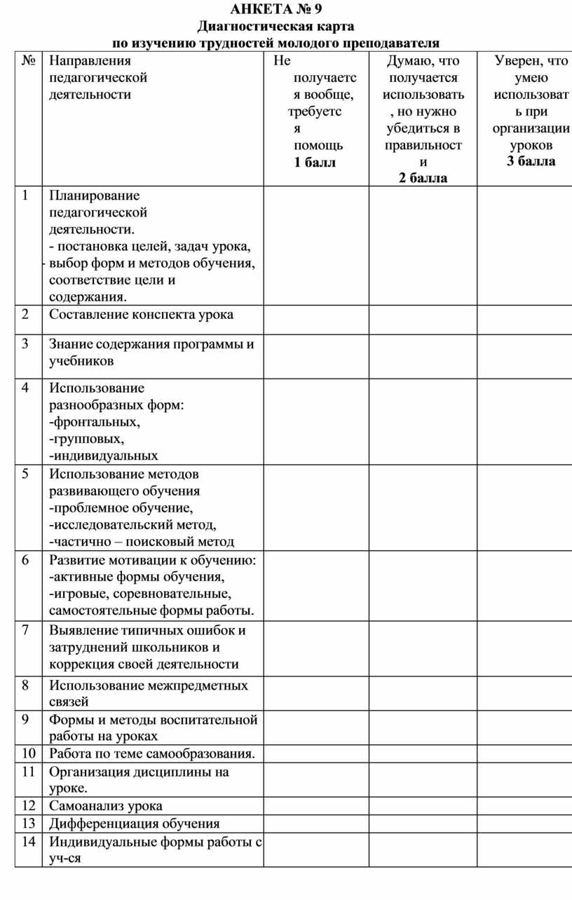 9. Диагностическая карта по изучению трудностей молодого учителя.