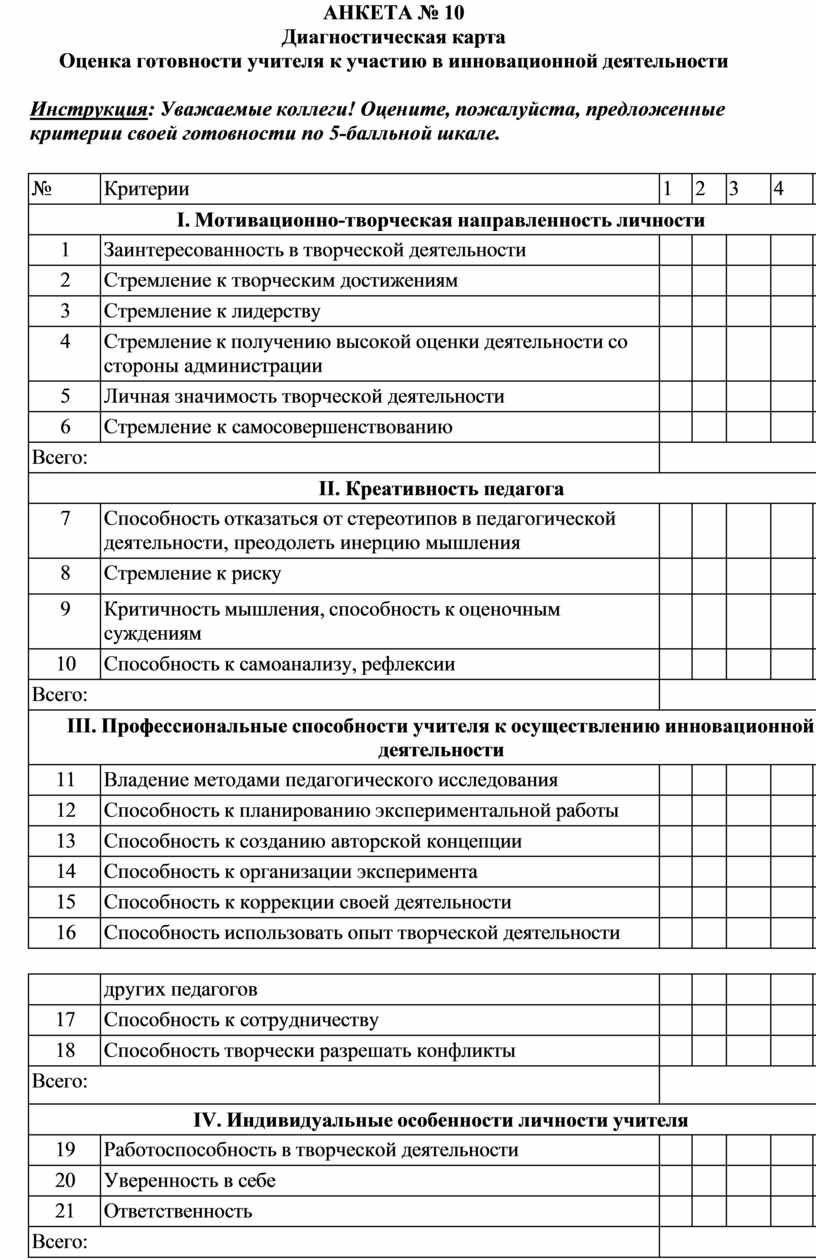 10. Диагностическая карта «Оценка готовности учителя к участию в инновационной деятельности»