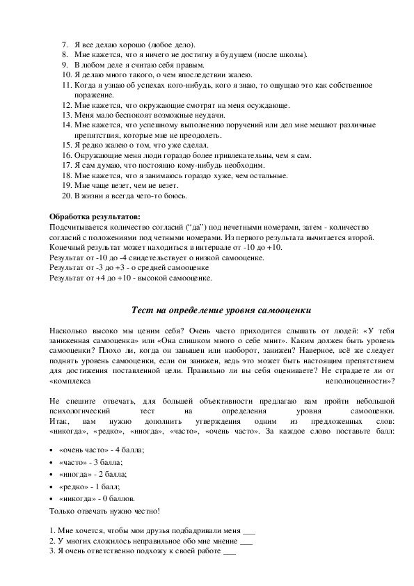 6.3 Самооценка «Опросник» для определения уровня самооценки учащихся
