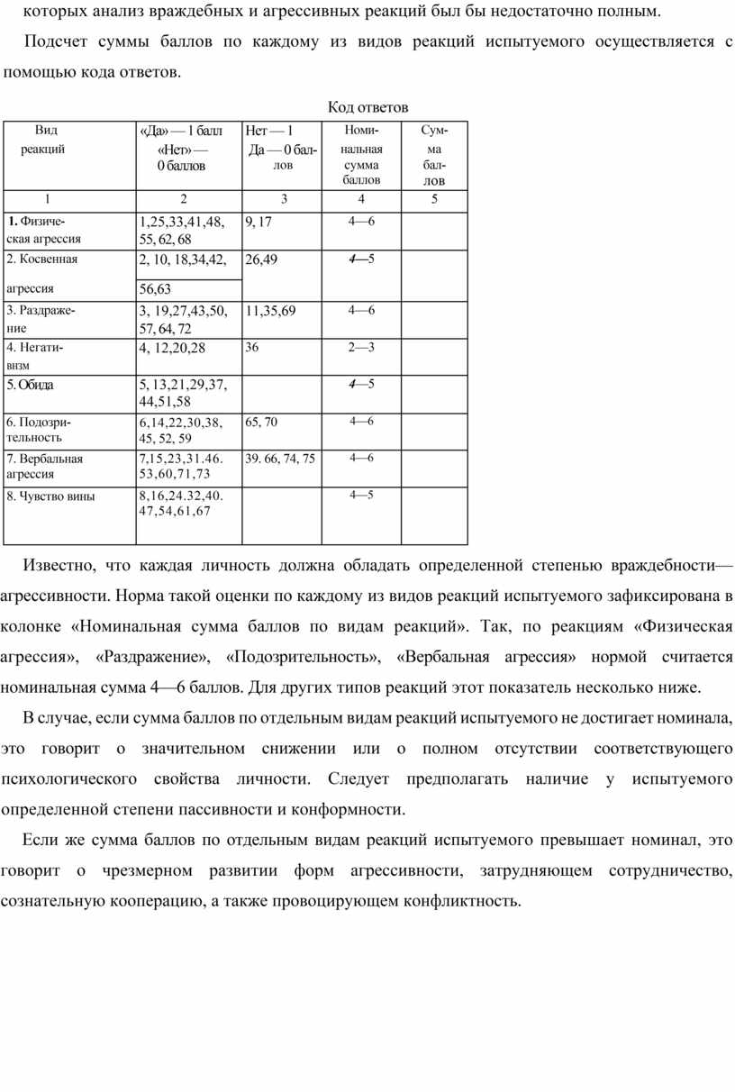 Известно, что каждая личность должна обладать определенной степенью враждебности—агрессивности. Норма такой оценки по каждому из видов реакций испытуемого зафиксирована в колонке «Номинальная сумма баллов по видам реакций». Так, по реакциям «Физическая агрессия», «Раздражение», «Подозрительность», «Вербальная агрессия» нормой считается номинальная сумма 4—6 баллов. Для других типов реакций этот показатель несколько ниже.