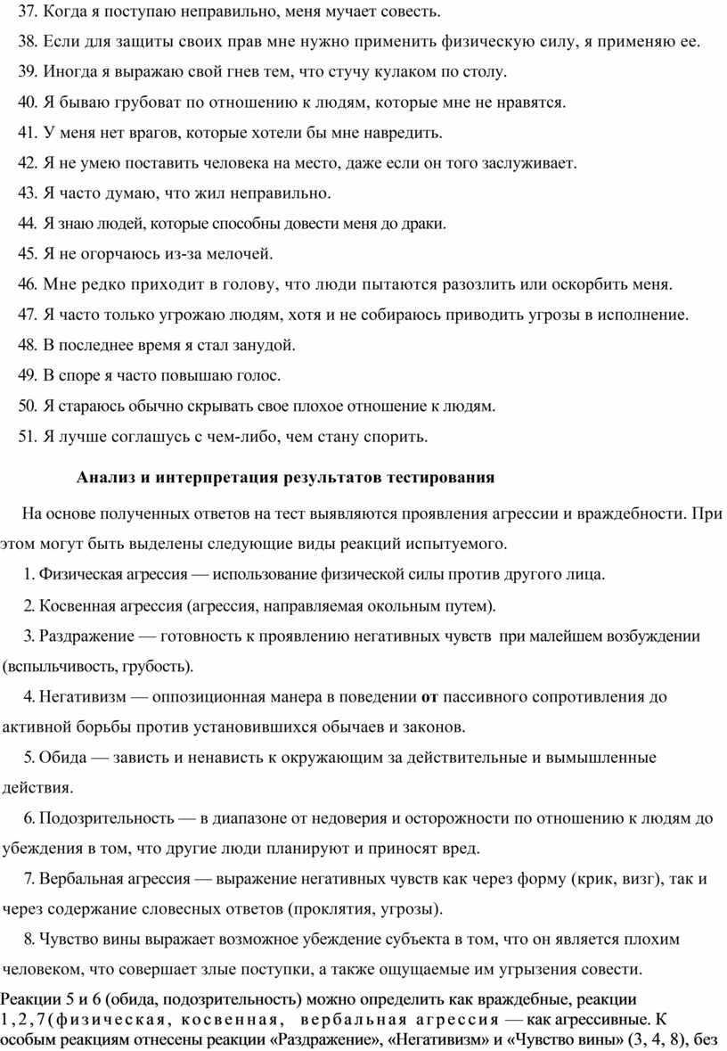 Реакции 5 и 6 (обида, подозрительность) можно определить как враждебные, реакции 1,2,7(физическая, косвенная, вербальная агрессия — как агрессивные. К особым реакциям отнесены реакции «Раздражение», «Негативизм» и «Чувство вины» (3, 4, 8), без которых анализ враждебных и агрессивных реакций был бы недостаточно полным.
