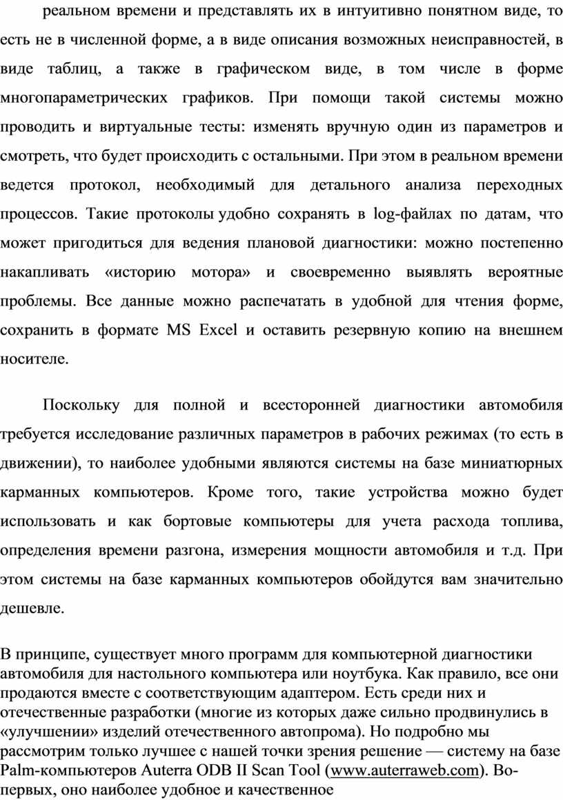 В принципе, существует много программ для компьютерной диагностики автомобиля для настольного компьютера или ноутбука. Как правило, все они продаются вместе с соответствующим адаптером. Есть среди них и отечественные разработки (многие из которых даже сильно продвинулись в «улучшении» изделий отечественного автопрома). Но подробно мы рассмотрим только лучшее с нашей точки зрения решение — систему на базе Palm-компьютеров Auterra ODB II Scan Tool (www.auterraweb.com). Во-первых, оно наиболее удобное и качественное (особенно по сравнению с отечественными изделиями), во-вторых — достаточно универсальное, а в-третьих — относительно дешевое (даже по сравнению с отечественными).