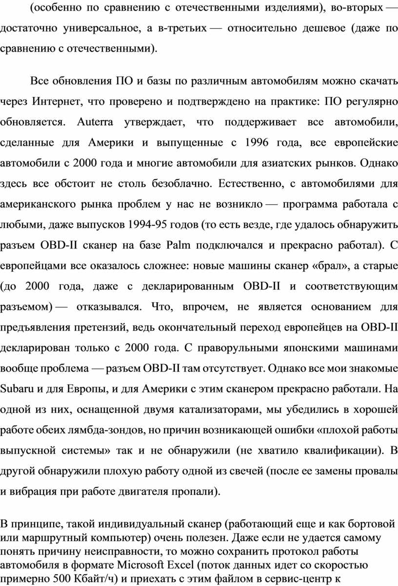 Все обновления ПО и базы по различным автомобилям можно скачать через Интернет, что проверено и подтверждено на практике: ПО регулярно обновляется. Auterra утверждает, что поддерживает все автомобили, сделанные для Америки и выпущенные с 1996 года, все европейские автомобили с 2000 года и многие автомобили для азиатских рынков. Однако здесь все обстоит не столь безоблачно. Естественно, с автомобилями для американского рынка проблем у нас не возникло — программа работала с любыми, даже выпусков 1994-95 годов (то есть везде, где удалось обнаружить разъем OBD-II сканер на базе Palm подключался и прекрасно работал). С европейцами все оказалось сложнее: новые машины сканер «брал», а старые (до 2000 года, даже с декларированным OBD-II и соответствующим разъемом) — отказывался. Что, впрочем, не является основанием для предъявления претензий, ведь окончательный переход европейцев на OBD-II декларирован только с 2000 года. С праворульными японскими машинами вообще проблема — разъем OBD-II там отсутствует. Однако все мои знакомые Subaru и для Европы, и для Америки с этим сканером прекрасно работали. На одной из них, оснащенной двумя катализаторами, мы убедились в хорошей работе обеих лямбда-зондов, но причин возникающей ошибки «плохой работы выпускной системы» так и не обнаружили (не хватило квалификации). В другой обнаружили плохую работу одной из свечей (после ее замены провалы и вибрация при работе двигателя пропали).