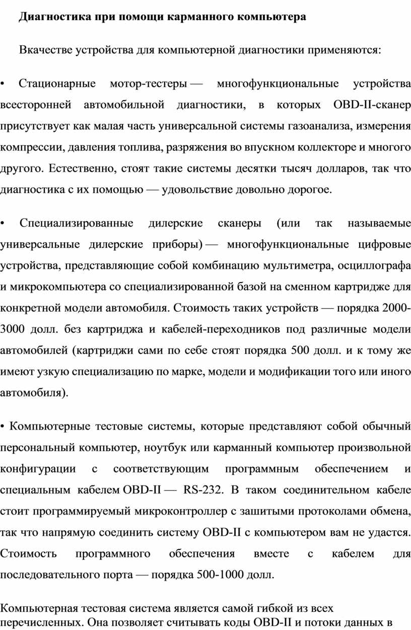 Поскольку для полной и всесторонней диагностики автомобиля требуется исследование различных параметров в рабочих режимах (то есть в движении), то наиболее удобными являются системы на базе миниатюрных карманных компьютеров. Кроме того, такие устройства можно будет использовать и как бортовые компьютеры для учета расхода топлива, определения времени разгона, измерения мощности автомобиля и т.д. При этом системы на базе карманных компьютеров обойдутся вам значительно дешевле.