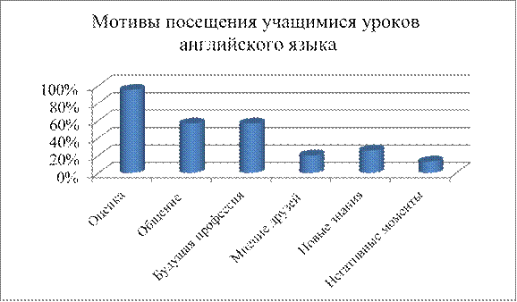 Ответы учителей английского языка на предложение проанализировать мотивы посещения учащимися уроков можно группировать в шесть основных групп: во - первых, почти все учителя (95%) считают, что на урок учащихся приводит желание получить оценку, во-вторых, по 54,5 % получили потребность в общении и необходимость знания английского языка для дальнейшего обучения и профессиональной деятельности, в - третьих,