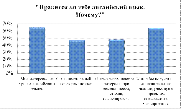 Для выявления причины интереса (нет интереса) к изучаемому предмету было проведено анкетирование учащихся начальных классов «Почему тебе нравится английский» (1риложение 1, таблица 1).
