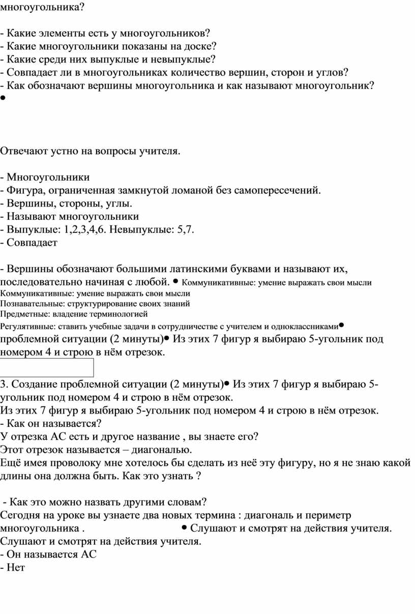 Регулятивные: проявляют познавательную активность Коммуникативные: планируют учебное сотрудничество с учителем и одноклассниками. Познавательные: самостоятельно планируют свою деятельность, прогнозируют результат Личностные: самоопределение Предметные: умение находить периметр, стороны, диагонали многоугольника |