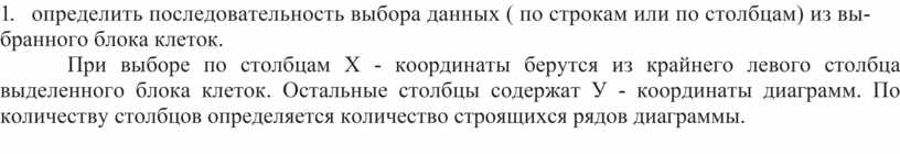 При выборе по столбцам Х - координаты берутся из крайнего левого столбца выделенного блока клеток. Остальные столбцы содержат У - координаты диаграмм. По количеству столбцов определяется количество строящихся рядов диаграммы.