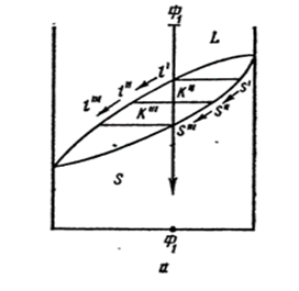 Начинают выпадать кристаллы состава S′. При охлаждении до точки К″выпадают кристаллы S″,состав расплава отвечает точке Ɩ″. По мере охлаждения состав кристаллов изменяется по кривой S′-S″-S‴,состав расплава –по кривой Ɩ′-Ɩ″-Ɩ‴. В точке S‴расплав окончательно застынет. Соотношение количеств выпавших кристаллов и расплава равно отношению КƖ :KS рычага Ɩ S. Если охлаждение проводить очень медленно , кристаллы все время обмениваются веществом с расплавом , становясь все ближе к составу S″, отвечающему фигуративной точке Ф1. Ecли охлаждение протекает быстро, то образуется механическая смесь кристаллов разных составов .Если вычерпывать выкристаллизовавшиеся первыми порции, более богатые тугоплавким компонентом, что неоднократным повторением процесса можно создать фракции , сильно обогащенные как А, так и В.