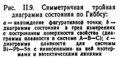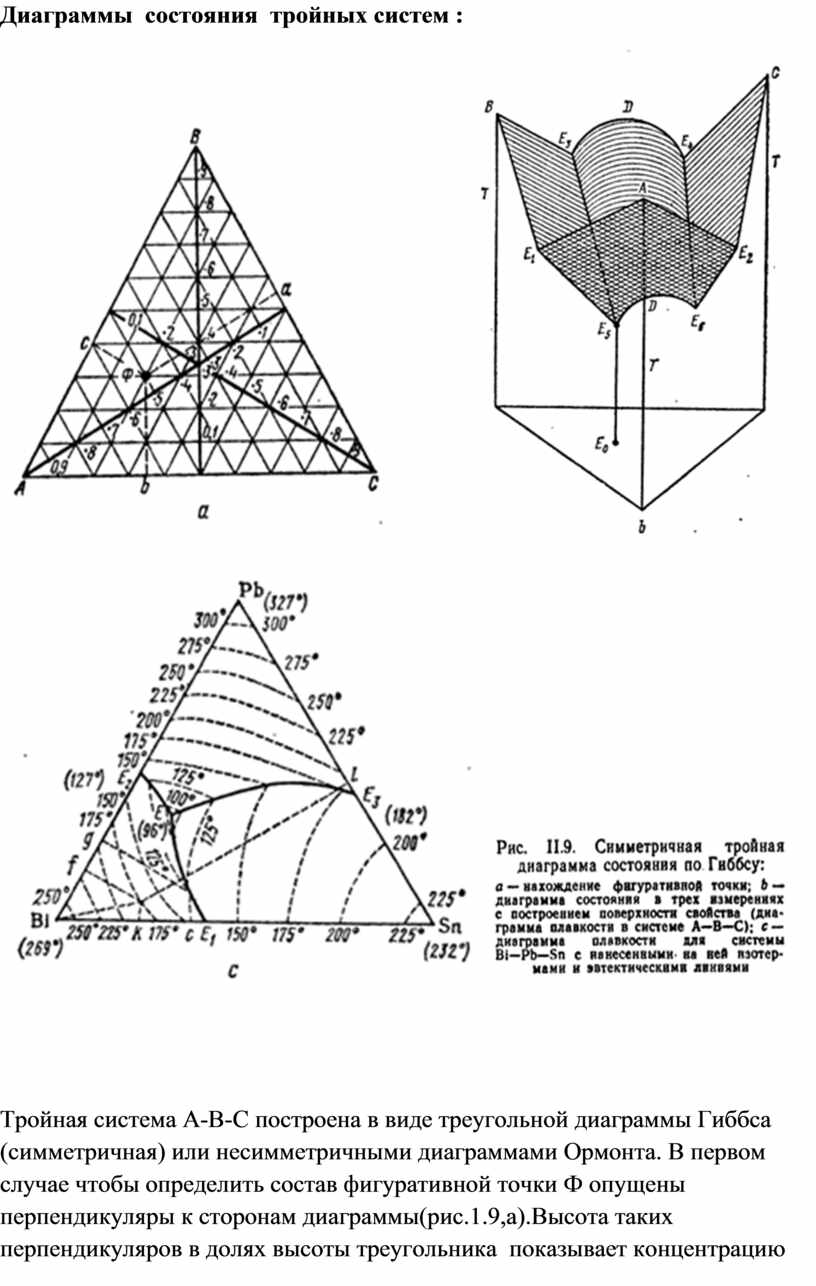 Тройная система A-B-C построена в виде треугольной диаграммы Гиббса (симметричная) или несимметричными диаграммами Ормонта. В первом случае чтобы определить состав фигуративной точки Ф опущены перпендикуляры к сторонам диаграммы(рис.1.9,a).Высота таких перпендикуляров в долях высоты треугольника показывает концентрацию компонента , символ которого помещен в противоположной вершине треугольника. Значение свойства задается двумя способами: высотой перпендикуляра (например Е0 Е5 на рис.11.9 b)к данной точке; совокупность вершин перпендикуляров образует поверхность представляющую зависимость состав – свойство в данной тройной системе или , 2)кривыми , отражающими на диаграмме геометрические места точек с равными свойствами . На рис.11.9, с показана диаграмма плавкости системы Вi-Рb-Sn, построенная по способу 2.