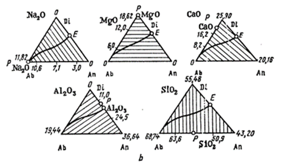 Рис.11.10 несимметричная тройная диаграмма состояния по Ормонту для системы альбит-анорит-диопсид. На сторонах диаграммы отложено содержание каждого простого оксида в процентах :a-общий вид диаграммы,b-эквиконцентрационные линии для пяти простых оксидов.На одной из сторон треугольника показан ход изменения концентрации даного оксида( рис.а). Cоединяя точку р для данного оксида, например Аl 2 O 3 ( если она лежит на стороне треугольника ), с противоположной вершиной , находим направление эквиконцентрационных линий, AbE-эвтектическая линия.