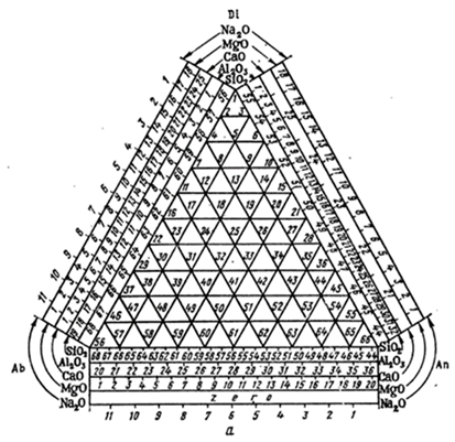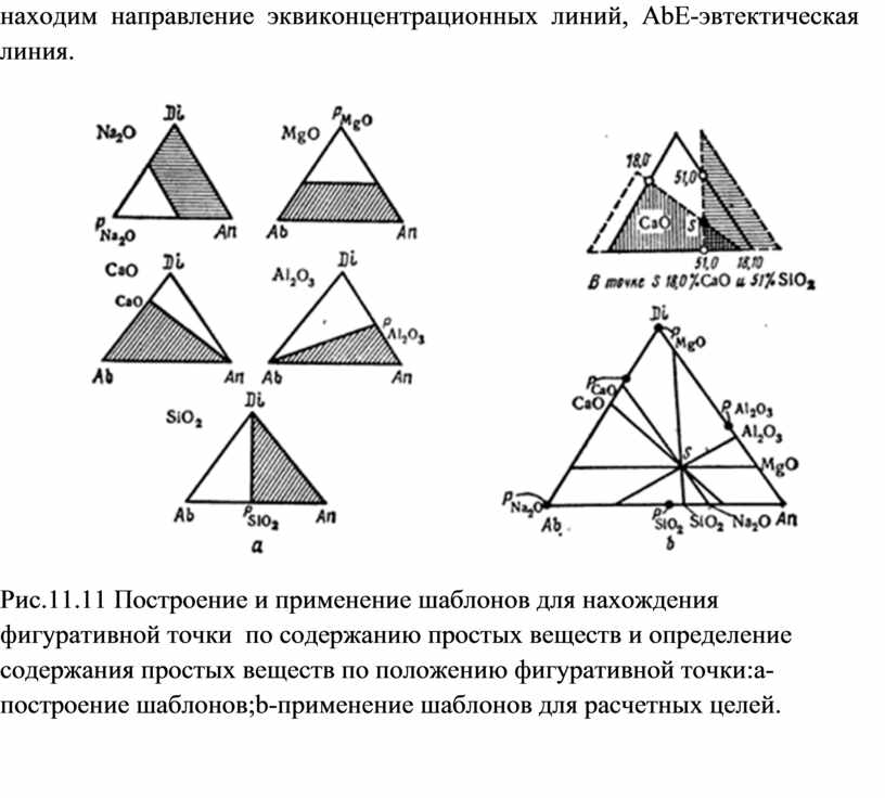 Концентрация любого простого оксида может быть представлена эквипотенциальными прямыми, которые для каждого оксида проходят под определенными углами к сторонам диаграммы (рис.11.10,b). Отложив на сторонах последней концентрационный масштаб и используя шаблоны, стороны которых направлены под углами, отвечающими эквипотенциальным линиям(рис.11.11, а), можно без всякого расчета найти по положению точки ее состав в простых оксидах . По химическому составу же можно найти сразу фигуративную точку(рис.11.11, б). Для этой цели нужно знать содержание некоторых (например двух или трех) простых оксидов , ибо в идеальном случае все прямые должны пересечься в одной точке S .Можно непосредственно связать химический и фазовый состав с ходом температур плавления, механических, оптических, электрических, и магнитных свойств фигуративных точек , значительно сократить количество аналитических определений.