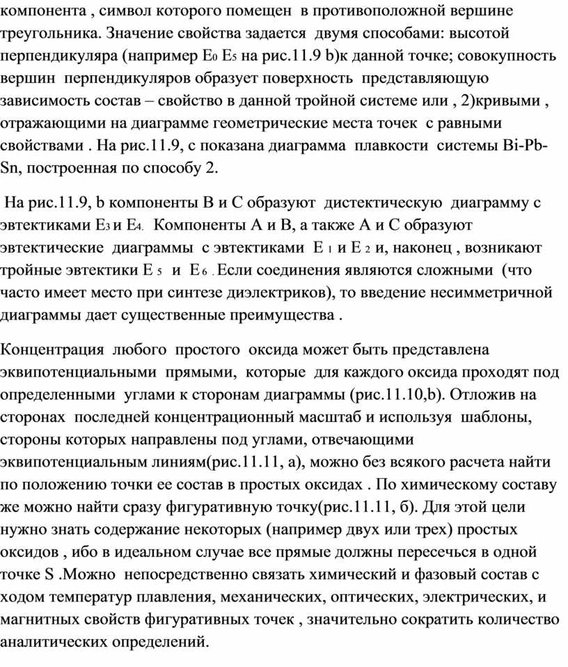 На рис.11.9, b компоненты В и С образуют дистектическую диаграмму с эвтектиками Е3 и Е4. Компоненты А и В, а также A и С образуют эвтектические диаграммы с эвтектиками Е 1 и Е 2 и, наконец , возникают тройные эвтектики Е 5 и Е 6 . Если соединения являются сложными (что часто имеет место при синтезе диэлектриков), то введение несимметричной диаграммы дает существенные преимущества .