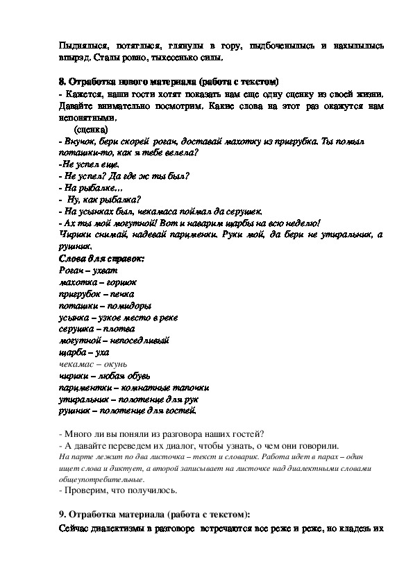 ищет слова и диктует, а второй записывает на листочке над диалектными словами