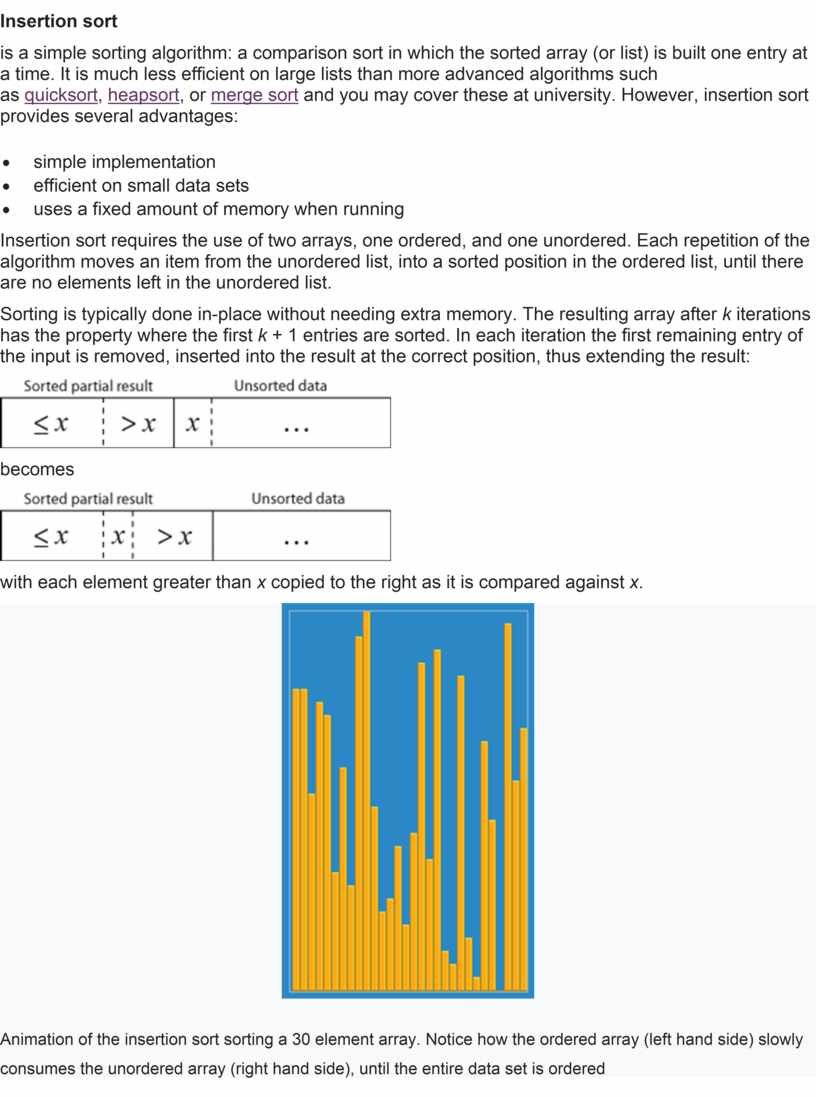 is a simple sorting algorithm: a comparison sort in which the sorted array (or list) is built one entry at a time. It is much less efficient on large lists than more advanced algorithms such as quicksort, heapsort, or merge sort and you may cover these at university. However, insertion sort provides several advantages:
