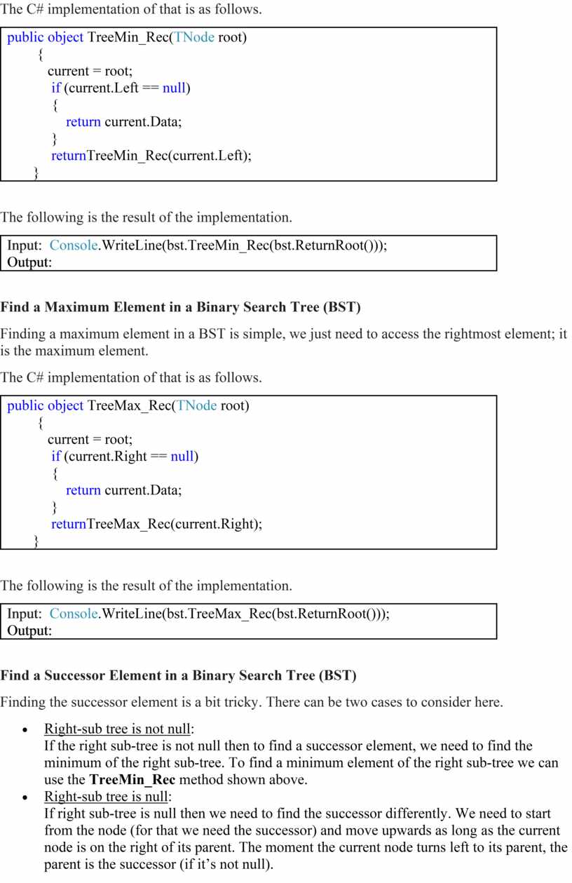 Input: Console.WriteLine(bst.TreeMin_Rec(bst.ReturnRoot())); Output: |
