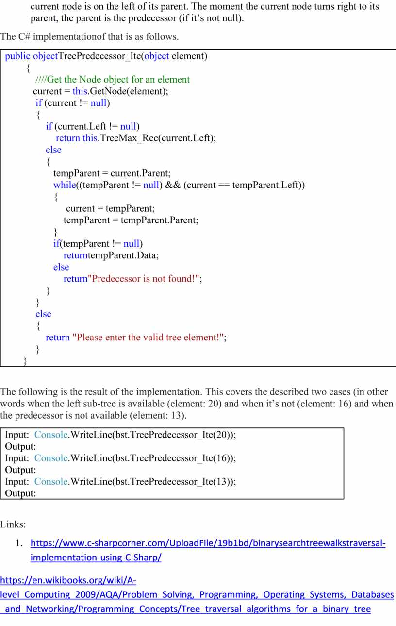 public objectTreePredecessor_Ite(object element) { ////Get the Node object for an element current = this.GetNode(element); if (current != null) { if (current.Left != null) return this.TreeMax_Rec(current.Left); else { tempParent = current.Parent; while((tempParent != null) && (current == tempParent.Left)) { current = tempParent; tempParent = tempParent.Parent; } if(tempParent != null) returntempParent.Data; else return"Predecessor is not found!"; } } else { return "Please enter the valid tree element!"; } } |