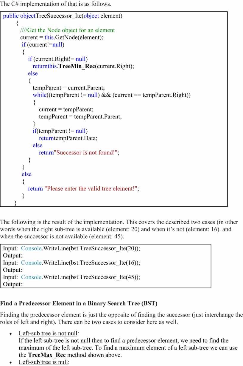 public objectTreeSuccessor_Ite(object element) { ////Get the Node object for an element current = this.GetNode(element); if (current!=null) { if (current.Right!= null) returnthis.TreeMin_Rec(current.Right); else { tempParent = current.Parent; while((tempParent != null) && (current == tempParent.Right)) { current = tempParent; tempParent = tempParent.Parent; } if(tempParent != null) returntempParent.Data; else return"Successor is not found!"; } } else { return "Please enter the valid tree element!"; } } |
