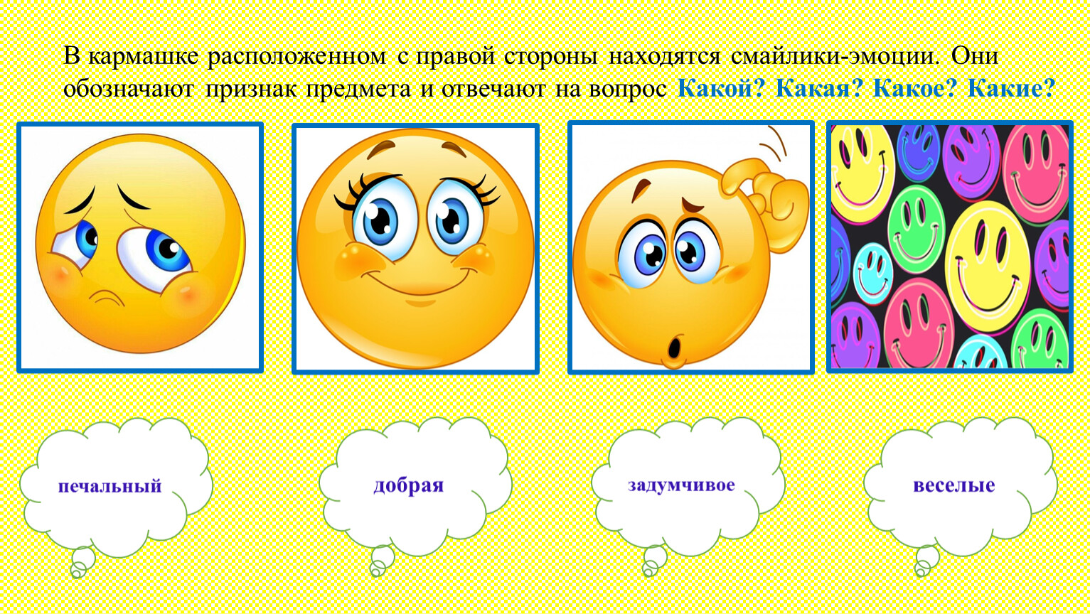 В кармашке расположенном с правой стороны находятся смайлики-эмоции. Они обозначают признак предмета и отвечают на вопрос Какой? Какая? Какое? Какие?