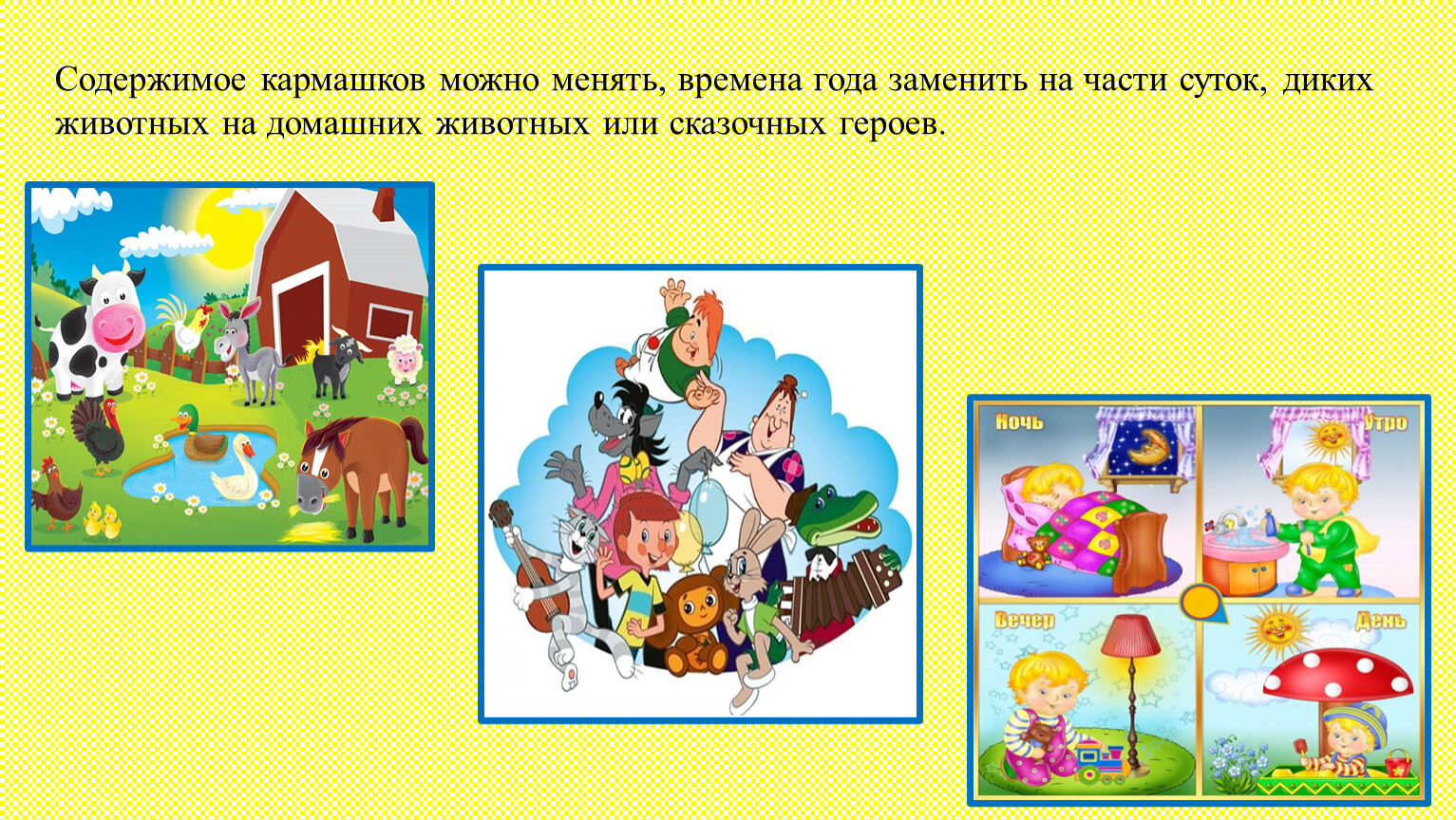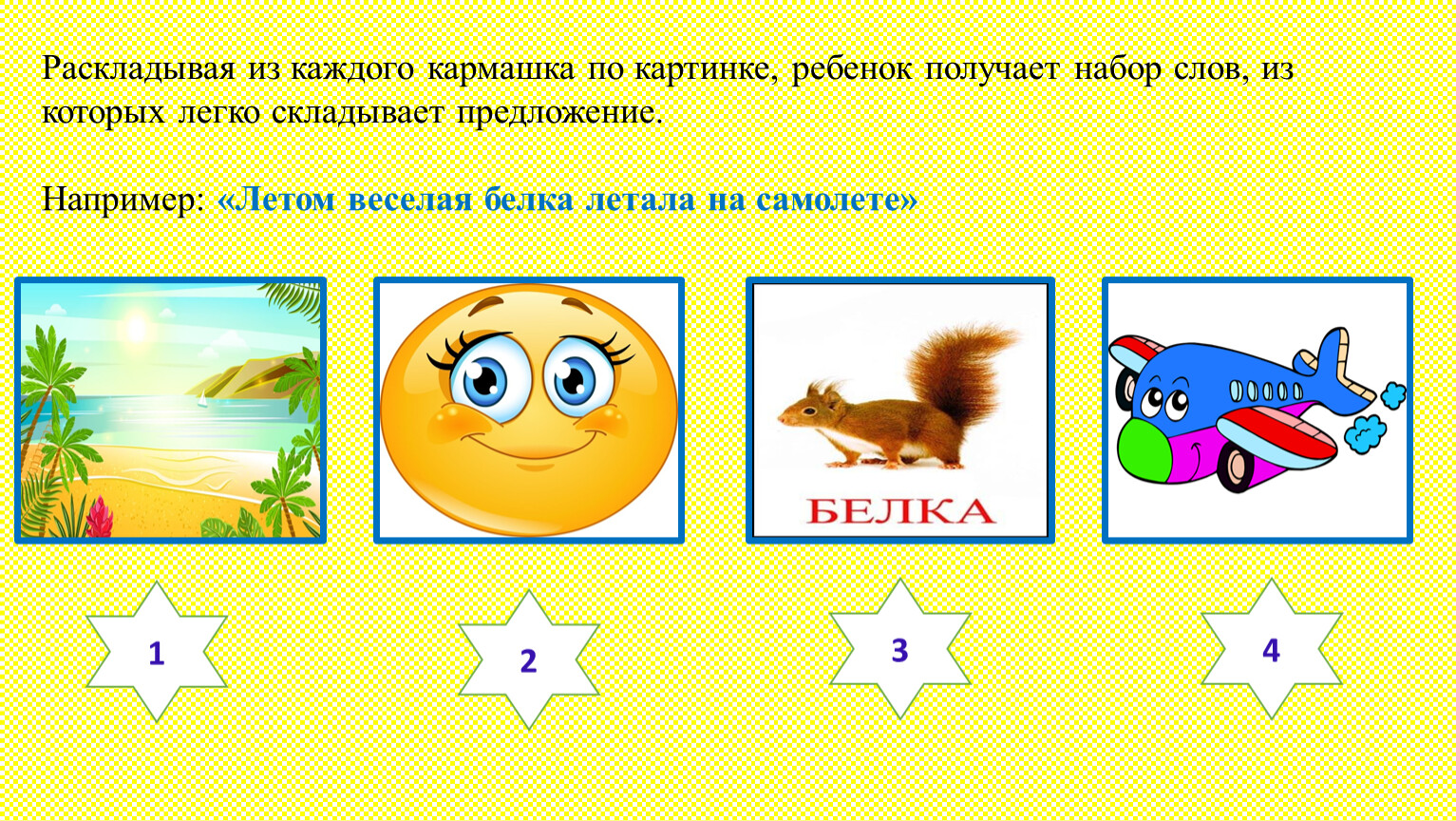 Раскладывая из каждого кармашка по картинке, ребенок получает набор слов, из которых легко складывает предложение.