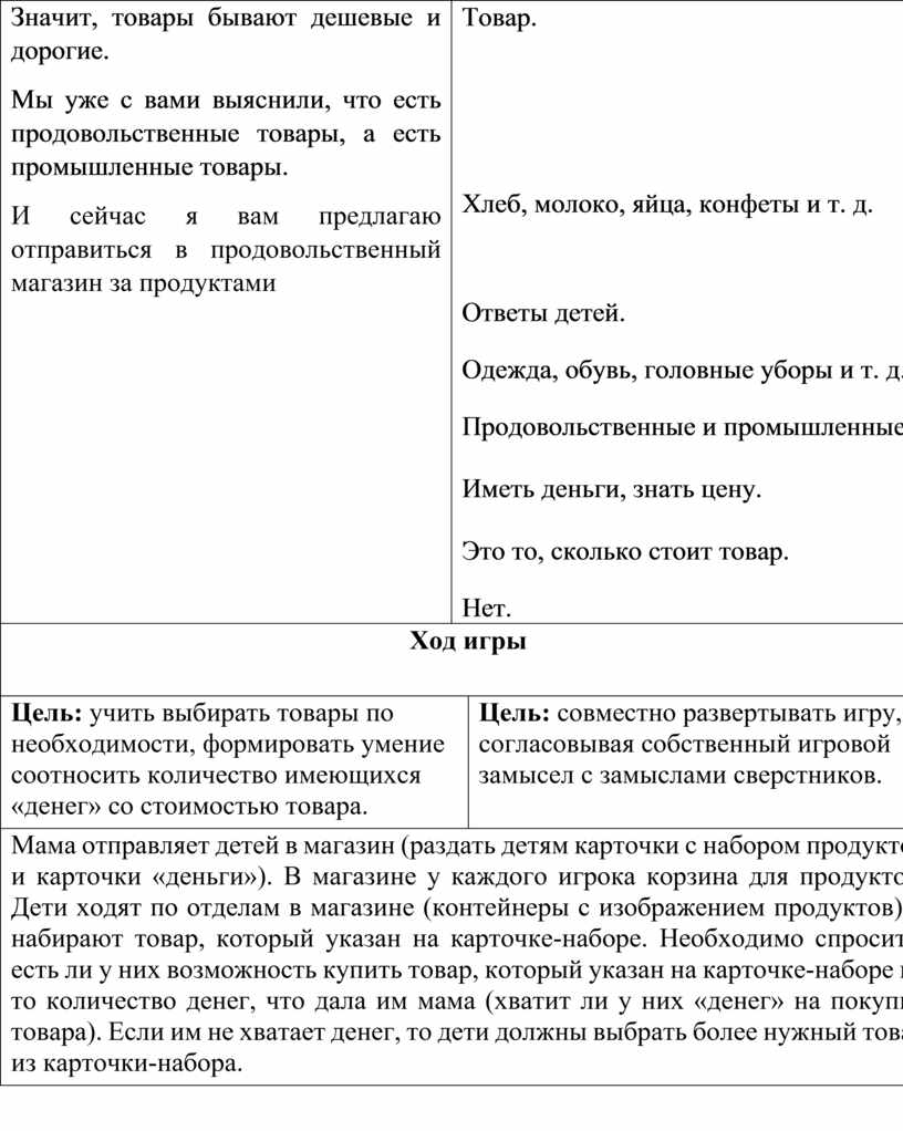 Цель: учить выбирать товары по необходимости, формировать умение соотносить количество имеющихся «денег» со стоимостью товара. |