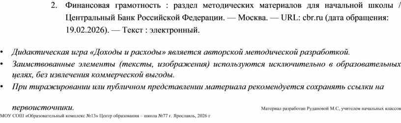 6. Финансовая грамотность : раздел методических материалов для начальной школы / Центральный Банк Российской Федерации. — Москва. — URL: cbr.ru (дата обращения:
