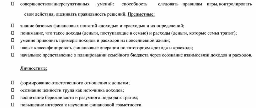 - умение соотносить жизненные ситуации с категориями доходов и расходов; развитие навыков принятия элементарных финансовых решений; формирование основ планирования личных финансов.