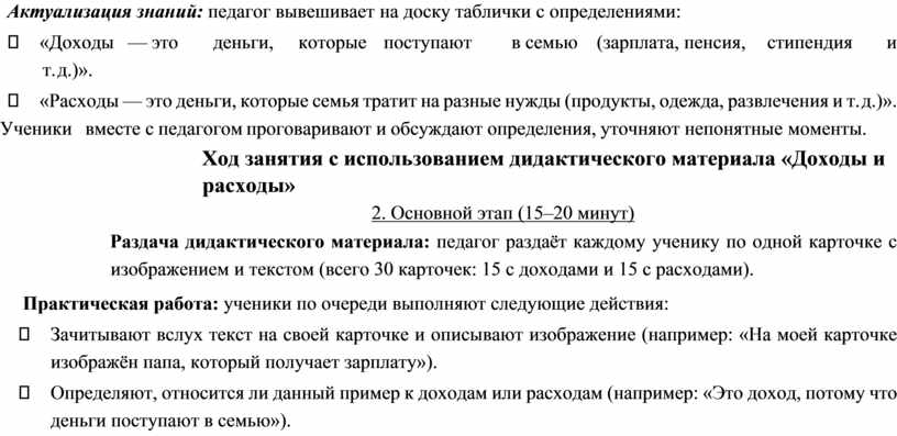 Раздача дидактического материала: педагог раздаёт каждому ученику по одной карточке с изображением и текстом (всего 30 карточек: 15 с доходами и 15 с расходами).